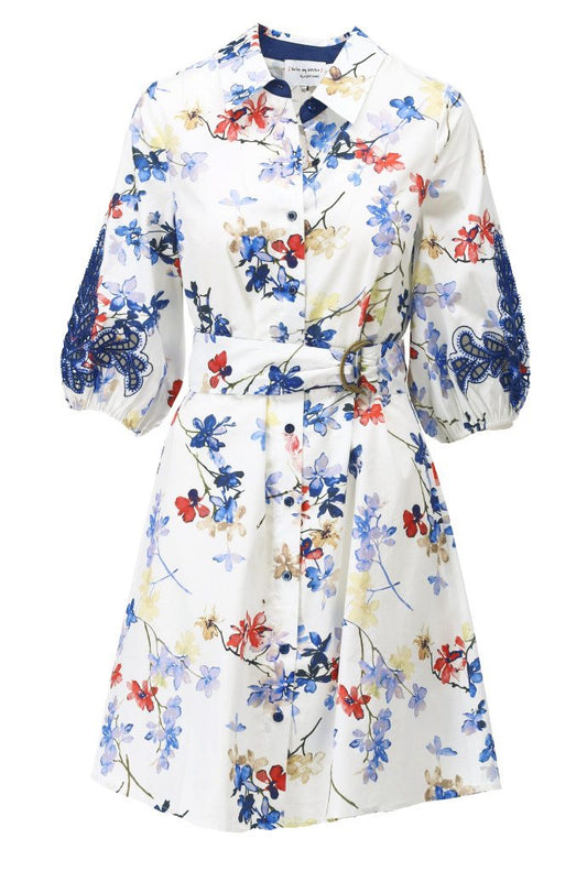 K-Design Floral Shirt Dress with Embroidered Sleeve - White/Navy