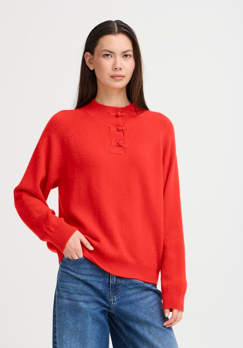 This medium-weight high neck jumper keeps you comfortable and ready for anything. Its clever design makes layering easy and the soft feel supports you through work and play, offering warmth and practicality in every moment. The fiery red Dasila sweater from ICHI is not only the brightest red, but the softest, cosiest knit with the cutest toggle fastening detail.