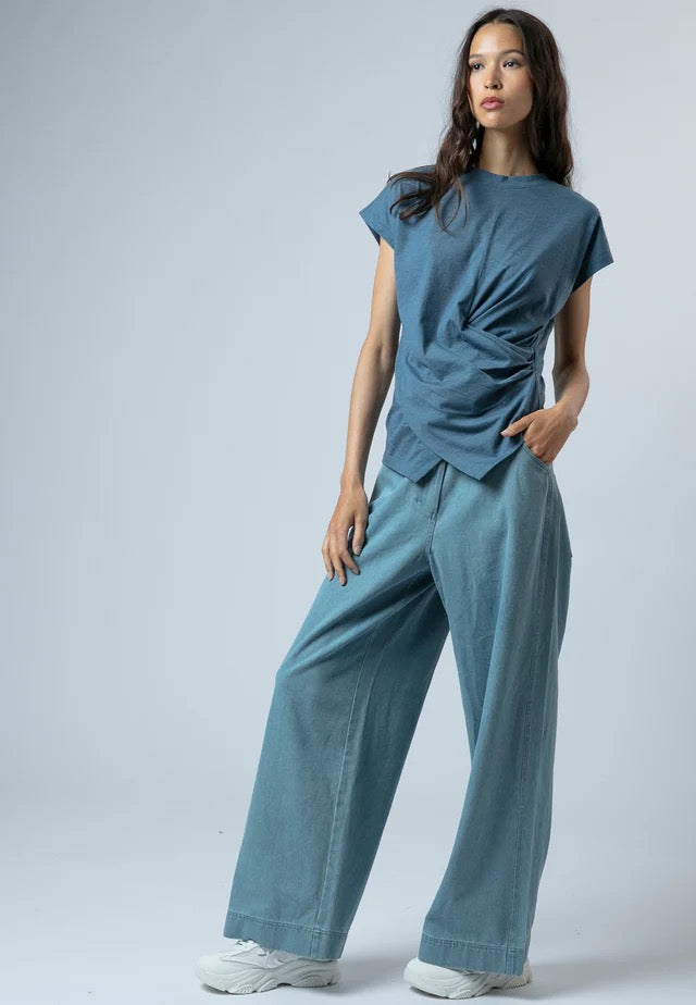The Time tee is a fitted tee in blue featuring drape detailing at the front hem, adding a twist to this easy basic. With a regular fit, crew neckline, and short sleeves, it's hip-length and made from soft and textured cotton jersey. A versatile everyday wardrobe essential. The model wears a size UK 10. Length from the top: 63 cm