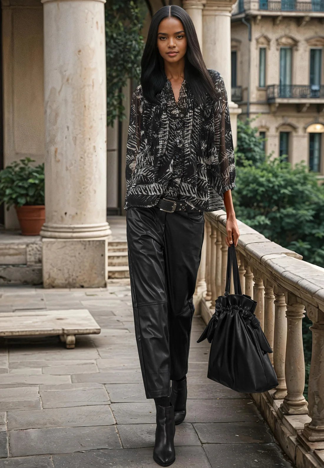 The Zoe Maxi Dress is a voluminous, relaxed-fit dress with a tiered, long-length design. Featuring a grandad collar, button placket, and a drawstring waist with tassels and skull cord ends, it also has long sleeves. Crafted from georgette with our foliage Vamp print in black and white, it has a short lining. Perfect for a chic, effortless look for any occasion. Wear with heels or ankle boots. The model wears a UK size 10. Length from the top: 138 cm