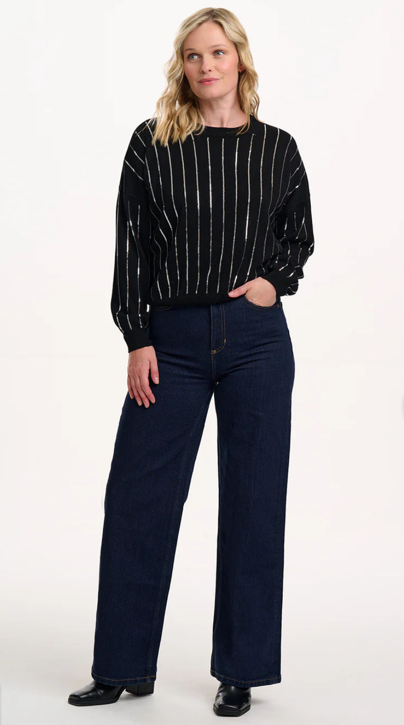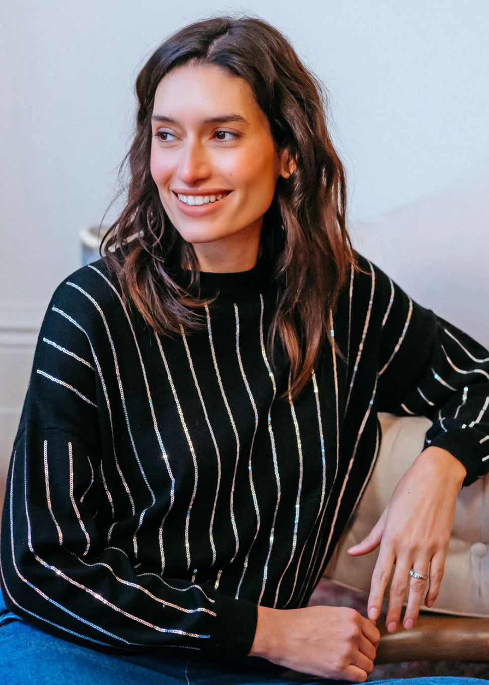 The Anjali Jumper blends comfort with a touch of sparkle. Designed with a relaxed fit, this mid-hip knit features ribbed trims and a round neckline for easy wear. Shimmering sequin stripes run vertically down the black base, adding a festive feel that transitions effortlessly from day to night. Pair with a satin skirt and heels for party-ready elegance, or keep it casual with jeans and boots.