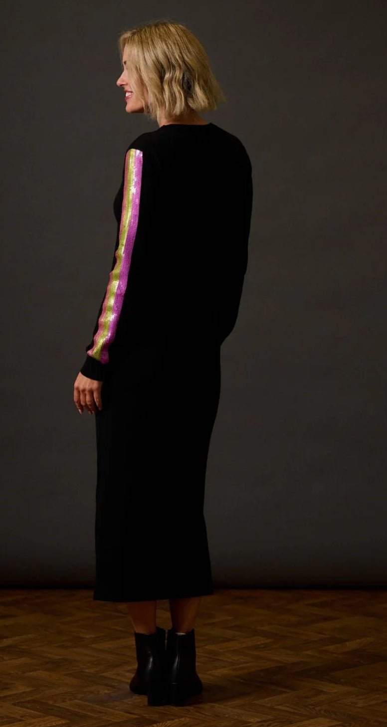 The Sonia Knit Midi Dress sister to "The Liselle" is a chic, semi-fitted style designed to flatter with its figure-skimming silhouette. Crafted from the same cosy, textured yarn as our Stacey Jumper, it features a classic crew neckline, long sleeves, and a split side hem for ease of movement. The standout detail lies in its bold rainbow-striped sleeve in pink, lime and purple — adding a playful twist against the sleek black base.